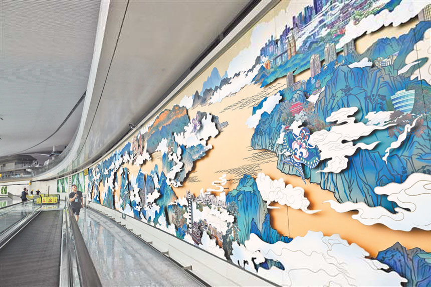 近日,江北国际机场T3B航站楼上新《山水之城》《英雄之城》《梦幻之城》《未来之城》四组指廊长卷,以艺术手法串联起重庆的自然禀赋、人文精神与未来愿景,让旅客在出行途中沉浸式感受“雄奇山水 新韵重庆”的独特魅力。