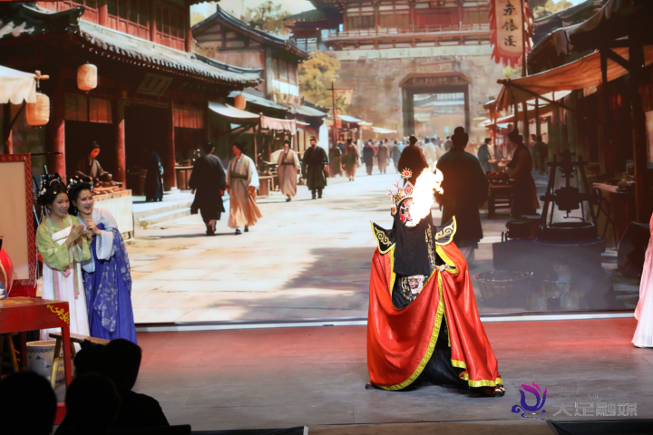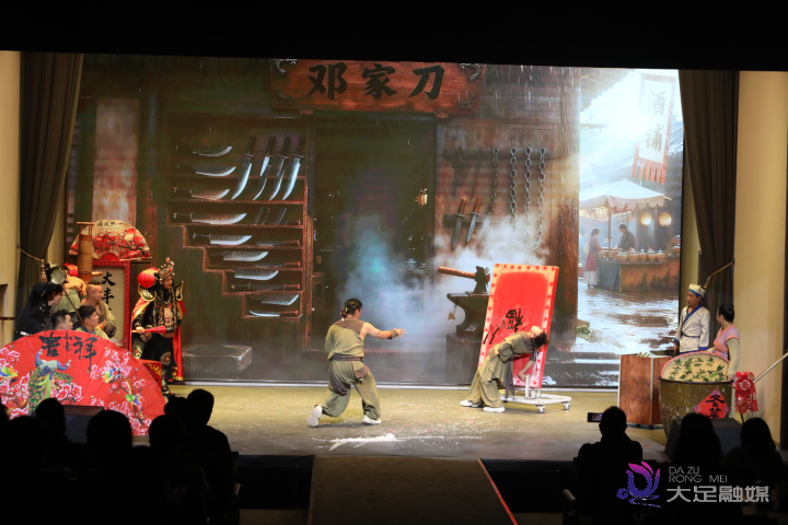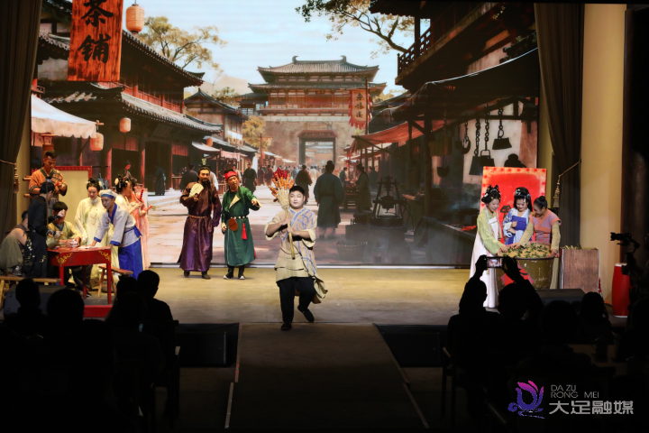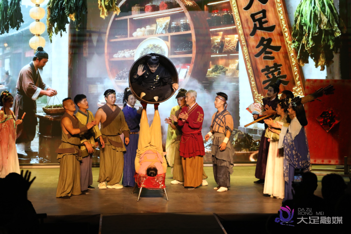 近日,昌州戏苑座无虚席,全新文旅演艺产品“忆昌州”民俗杂技秀首次公开亮相。上百名市民齐聚于此,在歌舞与杂技的交融中,感受千年昌州的文化韵味,见证大足石刻元素“活”跃在舞台之上。![]() ![]() 演出中,舞台背景屏上大足石刻宝顶山造像缓缓流转,演员身着复刻宋代石刻纹样的服饰,将舞蹈、杂技与非遗技艺巧妙融合。顶缸演员头部转动间,头顶大缸稳如磐石;绸吊演员凌空舒展,身姿宛如石刻中的“飞天”,让观众仿佛穿越千年,直面石刻艺术的灵动之美。 ![]() ![]() “‘忆昌州’民俗风情杂技秀以歌舞、杂技、魔术、民间绝活等艺术形式呈现,我们希望通过这种群众喜闻乐见的方式,唤回城市的历史记忆与文化记忆。”区文化馆馆长杨庆介绍。 ![]() 演出现场热闹非凡,互动环节更是将氛围推向高潮。“卖货郎”扛着插满糖葫芦的草靶走下台,刚递出第一串糖葫芦,就被眼尖的观众迅速接过。一旁的《川剧变脸》演员惊艳全场,一甩水袖,蓝脸瞬间换成浅绿脸谱,他走到观众身边近距离表演,引得大家连连惊呼。台上魔术师同样实力出众,站在屏风前随手一挥,烟花喷涌而出,“大丰大足”四个大字随之显现,台下掌声与叫好声此起彼伏,整个戏苑都沉浸在欢乐氛围中。 ![]() “今天特意带小朋友来体验大足文化,演出特别震撼,还融入了大足石刻元素。希望外地朋友多了解大足,大足石刻有很多值得观看和体验的风景与文化。”观众曹女士兴奋地说。 ![]() “我们将大足石刻中的‘孝文化’,以及龙水刀、大足冬菜等本土元素融入节目,全方位展示大足本土文化魅力,让更多游客领略大足文化的独特韵味。”区文化馆副馆长、“忆昌州”总导演江川表示。 (记者 熊敏秀) |