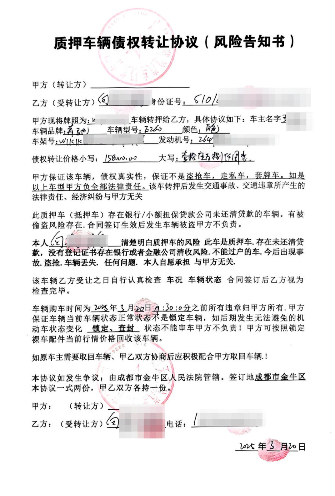 2023年的奔驰E300L标价仅6.88万元,2025年的奥迪A6L更是低至1.08万元……当下,在各大短视频直播平台,这些堪比“白菜价”的豪车让全国消费者趋之若鹜。然而,不少消费者在购买后却发现,刚买的车辆竟“悄悄”不见了。![]() ▲豪车“白菜价” 今年以来,多名消费者向红星新闻反映,他们在购买抵押、质押等权利瑕疵车辆后,车辆在短时间内均出现“被开走”的情况。其中,有成都公司被消费者提及。 记者了解到,事后,销售公司多以事先签订知情协议为由消极处理;警方则称属于民事纠纷尚未立案,建议消费者起诉解决。目前,多名消费者已起诉要求退款。 低价诱惑: 购车后车辆接连“失踪” 多名消费者的购车地在成都福宁路3号负三楼。在这个贴有“四川资产拍卖处置中心”字样的停车场里,高档豪车仅需几万元,远低于市场价。 向先生是在此购车的消费者。今年3月,他在抖音平台看到一辆二手奔驰敞篷跑车只要15.8万元,远低于市场价十多万元。然而购车几天后,停在地库的车就被他人悄悄开走,现场只留下一张《取回车辆告知函》,称该车有抵押问题,需按合同约定收回车辆。 黄女士也同样有此遭遇。今年7月,她花11.98万元买下一辆奔驰车,虽知是抵押车,但“对方说半年就可以过户”,且称已拆除车内所有GPS。然而,车辆还是在十多天后被他人私自开走。 ![]() ▲小区监控视频拍到,黄女士买的车凌晨被人开走 来自西安的魏女士、广汉的李先生以及乐山的魏先生购买车后,车辆也同样被开走。当他们找到销售公司时,对方态度消极,“要我们去报警,去起诉他们。” 向先生等人无奈只有提起诉讼。 记者梳理发现,上述消费者的合同签订方与车款收款方均为不同公司,包括成都市车好利汽车销售有限公司、成都诚祥五点半汽车销售有限公司、成都易多惠汽车销售有限公司以及成都天蕴健汽车服务有限公司。这些于去年、今年成立的公司,注册资本3万-10万元。多家公司名下均涉及十余起案件,多为买卖合同纠纷。目前,多家公司因不在登记场所经营而被列入经营异常。 法律人士称,由于这些公司均为“有限责任”公司,承担有限责任,就算消费者胜诉,也可能拿不回车款。 抵押车权利瑕疵: 消费者或面临“车财两空” 记者了解到,上述消费者购买的均为抵押、质押车辆。由于这类车辆存在权利瑕疵,无法过户,价格会比实际车价低很多。但由于价格低,车商低价买进、加价卖出,利润高,就算有风险,“大家也会抢着要”。 记者看到,上述消费者在买车时都与销售公司签订了债权转让协议。协议中提及,消费者本人清楚车辆有被清收、暂无法过户的风险,且从消费者接收车辆时起,发生丢失、盗抢,均与转让方无关。 ![]() ▲向先生提供的质押车辆债权转让协议 但消费者表示,当时销售方用各种说辞以及公证文书让他们相信,虽是抵押车,但购车后的权利是可以得到保障的。 一段售前录音显示,销售方曾向消费者承诺,“若被拖车,你们可以将车再卖给公司,公司再去找原车主进行售后。”在购车者与销售人员的聊天中也提到,公司为车辆提供全车GPS大拆、防盗锁系统全部更换、加装由本人控制的防盗卫星定位系统等九大权益。但最终车还是被开走了。 四川一上律师事务所合伙人林小明律师表示,上述“免责”协议属于异常增加一方责任而无限减轻另一方主要责任,有违公平及公序良俗原则,且不能实现合同的根本目的,一般来说可能会被认定无效。但在实际过程中,消费者还是应仔细查看合同内容,若明知有瑕疵仍愿购买,极可能被认定应自担风险。 车商回应: 购车者签合同前知晓风险 近日,记者以车辆被盗消费者身份来到福宁路3号的卖场。这里安保严密,需工作人员刷脸才能进入。卖场很大,现场有上百辆车,数名主播正在直播卖低价车。 ![]() ▲一辆奥迪A4标价“1.58万” 负责售后的曹姓负责人告诉记者,有三个解决途径——报警、起诉原车主还车,也可以让他们再有偿找车。 对于为何多人购车后都被开走,他声称所有资产处置车在没过户前都有被盗风险,“如果能过户就不是这个价格了,至少要贵一半。” 对于为何他人能通过定位找到车?他表示其他人是通过其他渠道获得的定位,否认泄露客户信息,否认与他人串通拖车,称他们只是在中间吃差价,“不可能把车卖出来,又把车偷回去……” 从他口中,记者得知该卖场至少有上述车好利、诚祥、易多惠三家公司在此经营,但他们的注册地均不在此。他表示,“(面向)全国卖”,办了很多营业执照在做直播,个人也在做直播。 后来,记者表明身份电话采访,曹姓负责人依旧否认串通,称“债权车就有被拖风险,合同已写明,但很多人就是图便宜”。至于为何注册地与实际经营地不同,他直接挂断电话。 行业乱象: 权属不明,易产生纠纷 记者了解到,目前二手车买卖属于备案制,非许可制。二手车没有统一交易平台,只要其经营范围包含二手车买卖,并在商务部门进行备案,均可从事相关业务。 业内人士介绍,由于二手车不像房屋买卖需要登记,多次抵押、买卖后,权属不明,很容易产生纠纷,且抵押车常常安装多个GPS,“有的GPS几天才会发射一次信号,无法被完全清理”,只要车主上路跑,就容易被精准定位、被拖车。 而由于消费者明知有权属瑕疵仍自愿购买,商家交付车辆后在消费者手中不见了,再找公司退钱,若无确凿证据证明卖方与拖