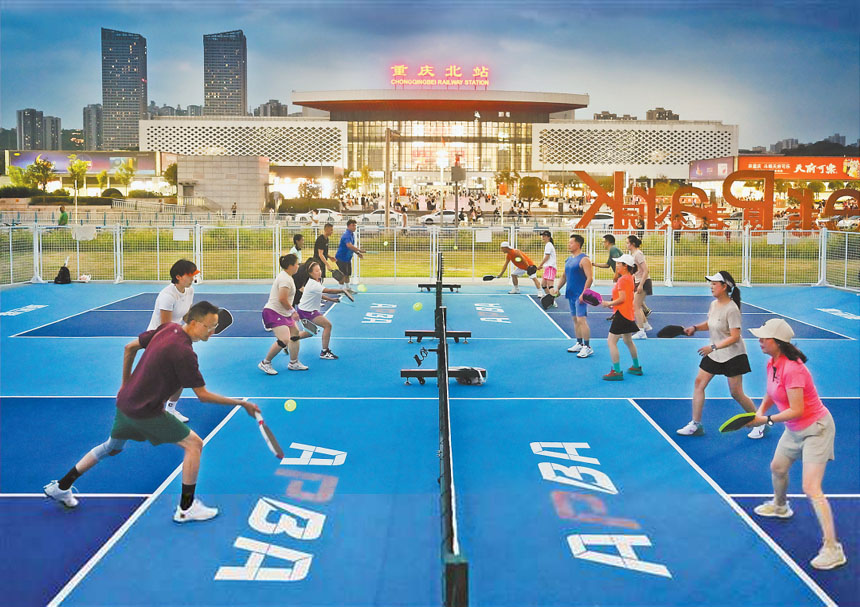 当日,重庆两江新区天宫殿街道志愿者公园的匹克球场地正式免费向市民开放。其中,夜光匹克球颇受市民青睐。夜幕降临后,发光的球与球拍成为一道独特的风景线。市民们在夜色中享受运动乐趣,尽显重庆全民健身的蓬勃活力。(记者 刘力 摄/视觉重庆)