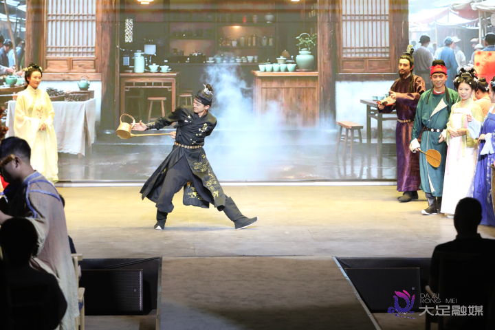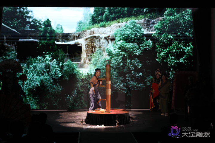 近日,昌州戏苑座无虚席,全新文旅演艺产品“忆昌州”民俗杂技秀首次公开亮相。上百名市民齐聚于此,在歌舞与杂技的交融中,感受千年昌州的文化韵味,见证大足石刻元素“活”跃在舞台之上。![]() ![]() 演出中,舞台背景屏上大足石刻宝顶山造像缓缓流转,演员身着复刻宋代石刻纹样的服饰,将舞蹈、杂技与非遗技艺巧妙融合。顶缸演员头部转动间,头顶大缸稳如磐石;绸吊演员凌空舒展,身姿宛如石刻中的“飞天”,让观众仿佛穿越千年,直面石刻艺术的灵动之美。 ![]() ![]() “‘忆昌州’民俗风情杂技秀以歌舞、杂技、魔术、民间绝活等艺术形式呈现,我们希望通过这种群众喜闻乐见的方式,唤回城市的历史记忆与文化记忆。”区文化馆馆长杨庆介绍。 ![]() 演出现场热闹非凡,互动环节更是将氛围推向高潮。“卖货郎”扛着插满糖葫芦的草靶走下台,刚递出第一串糖葫芦,就被眼尖的观众迅速接过。一旁的《川剧变脸》演员惊艳全场,一甩水袖,蓝脸瞬间换成浅绿脸谱,他走到观众身边近距离表演,引得大家连连惊呼。台上魔术师同样实力出众,站在屏风前随手一挥,烟花喷涌而出,“大丰大足”四个大字随之显现,台下掌声与叫好声此起彼伏,整个戏苑都沉浸在欢乐氛围中。 ![]() “今天特意带小朋友来体验大足文化,演出特别震撼,还融入了大足石刻元素。希望外地朋友多了解大足,大足石刻有很多值得观看和体验的风景与文化。”观众曹女士兴奋地说。 ![]() “我们将大足石刻中的‘孝文化’,以及龙水刀、大足冬菜等本土元素融入节目,全方位展示大足本土文化魅力,让更多游客领略大足文化的独特韵味。”区文化馆副馆长、“忆昌州”总导演江川表示。 (记者 熊敏秀) |